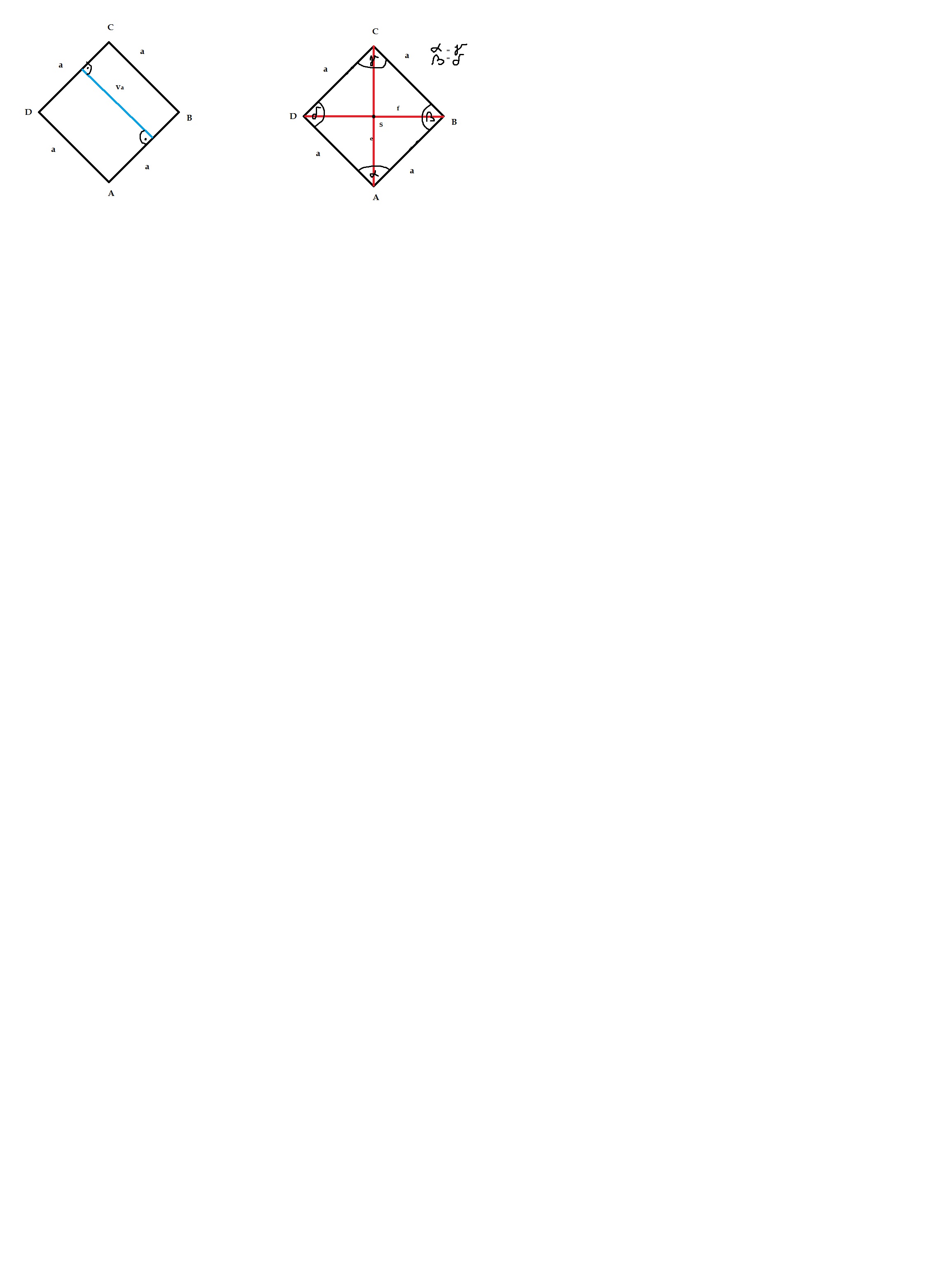 Uhlopriečky kosoštvorca nie su zhodné, rozpoľujú sa v bode S a sú na seba kolmé. Uhlopriečka z bodu A do bodu C je e, a uhlopriečka z bodu B do bodu C je f.
